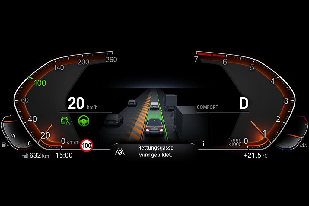 Los sistemas para la conducción y el estacionamiento semiautomatizados disponibles de serie u opcionalmente para el nuevo BMW Serie 5 Touring marcan pautas en el entorno competitivo con su variedad de funciones fiabilidad y ventajas para el día a día. Lo más destacado de la gama es el Driving Assistant Professional opcional, que incluye asistente de dirección y de guiado de carril y control de crucero con función Stop & Go. En EE.UU., Canadá y Alemania está disponible el Asistente de Autopista, que libera al conductor de las tareas de dirección en autopistas con carriles direccionales estructuralmente separados. A velocidades de conducción de hasta 130 km/h es posible retirar las manos del volante y colocarlas cómodamente siempre que se vigile de cerca el tráfico. El sistema también incluye el exclusivo asistente activo de cambio de carril con activación ocular.