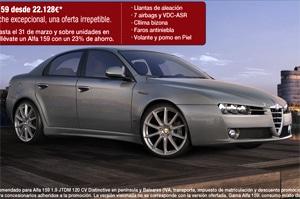 La semana pasada Fiat lanzaba una nueva campaña promocional: un 30 por ciento de descuento para sus coches en stock. Esta vez le toca a Alfa Romeo, que hasta el próximo 31 de marzo venderá sus coches con entre un 18 y un 25 por ciento de rebaja.Los Alfa Brera y Spider se promocionan con un 18 por ciento. En euros, el ahorro puede ser de hasta 9.000 euros. Para los 159 y 159 SW la campaña es del 23 por ciento (otros 9.000 euros de ahorro) y para el 147 y para el GT del 25 por ciento (hasta 7.000 y 8.000 euros de ahorro, dependiendo del modelo y de la versión).