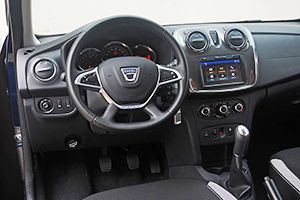 En el interior, Dacia propone un nuevo ambiente más cualitativo con elementos de cromo satinado en el salpicadero (aireadores, contadores, frontal central, moldura central del volante), los tiradores de puerta y la palanca de velocidades. El nuevo volante ahora ofrece cuatro radios, integra el claxon en el centro e integra logotipo de la marca. Está revestido con un plástico que da la sensación de ser bastante resistente y no tiene un mal tacto, aunque sí se nota, muy levemente, una pequeña rebaba formada por la zona de unión del molde del aro.