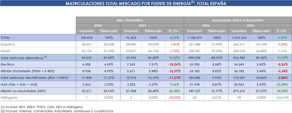 En cuanto a las matriculaciones del total de vehículos alternativos (electrificados, híbridos y de gas), se mantienen como primera opción de compra con la mitad de las ventas totales, registrando 50.233 unidades y un aumento del 15,2%. Durante noviembre, los híbridos convencionales se mantienen como la opción más elegida, con el 35% de todo el mercado. En el total del año se acumulan 490.234 ventas, con un crecimiento del 17,8%.