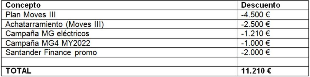 La nueva gama 2023 del eléctrico de MG no ha subido de precio, a pesar de incorporar un mayor equipamiento. Los nuevos MG4 Standard (20.480 euros), MG4 Confort (24.980 euros) y MG4 Luxury (26.980 euros) siguen siendo las alternativas más accesibles y con una mejor relación calidad-precio de su segmento. Además, las unidades que quedan a la venta del modelo de 2022 reciben un descuento adicional de 1.000 euros, con lo que el MG4 queda por debajo de los 2.000 euros, con un precio de tarifa a partir de 19.480 euros. En total, los descuentos y ayudas aplicadas a estos modelos pueden superar los 11.000 euros.