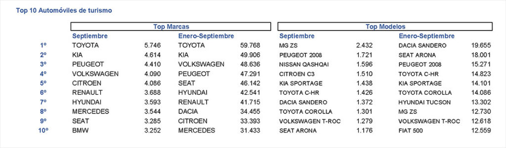 Toyota ha sido el fabricante que ha liderado las ventas en España durante el pasado mes, gracias a los 5.746 vehículos matriculados. En segunda posición también es novedad Kia, que comercializó un total de 4.614 vehículos. Y, como novedad, emerge Peugeot, que en septiembre se ha situado tercera por delante de Volkswagen. La firma francesa matriculó 4.410 unidades. En el acumulado de año, Toyota se mantiene firme con 59.768 matriculaciones.