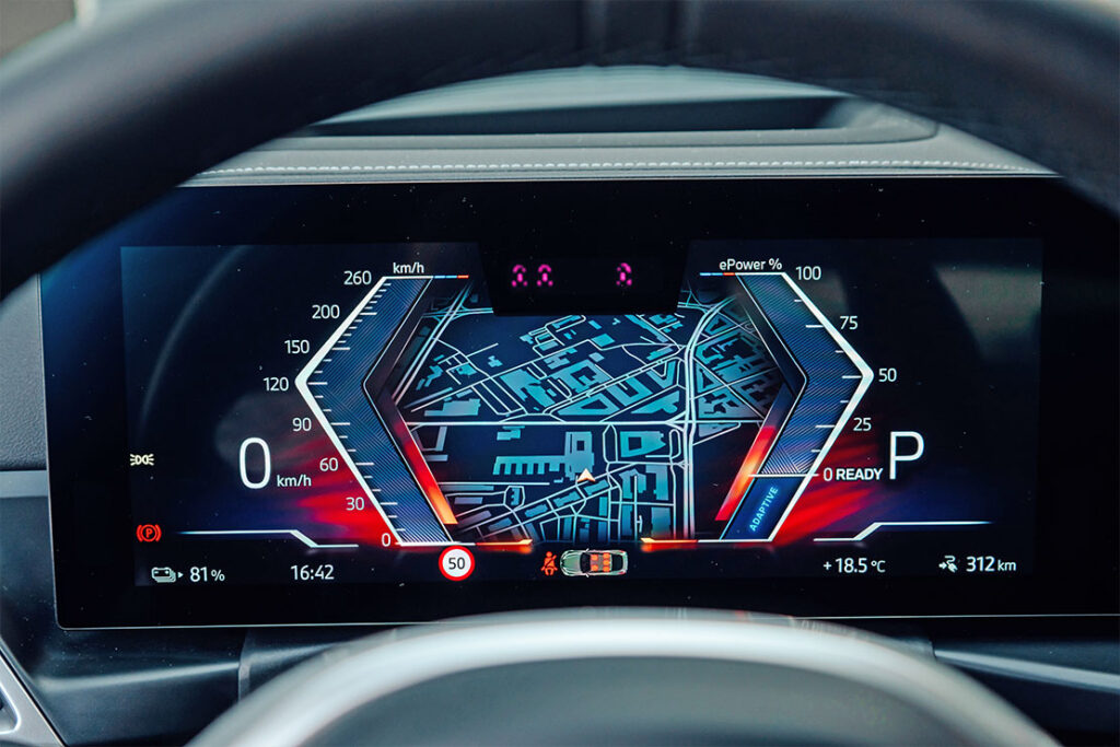 En ciudad, la entrega de potencia es suave y resulta muy fácil dosificar el acelerador. El coche invita a una conducción relajada gracias a su silencio de marcha y al aislamiento acústico. En vías rápidas, la reserva de potencia permite adelantar con solvencia sin necesidad de hundir el pedal. No se percibe vacío en ninguna zona del cuentavueltas eléctrico.
