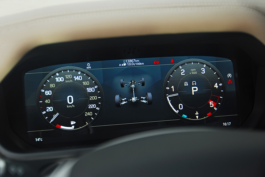 Nuestra unidad de pruebas equipaba la suspensión neumática electrónica (comercialmente se denomina 'Adaptive Dynamics'). La amortiguación adaptativa del sistema supervisa los movimientos de la carrocería hasta 500 veces por segundo y responde de forma casi instantánea para optimizar el control y el confort. Ofrece una elevación de altura de 75 mm en situaciones off road y un confort de conducción superior sobre cualquier superficie. La elevación adicional de 70 mm permite que el sistema neumático pueda subir la carrocería un máximo de 145 mm cuando sea necesario, mientras que la función Elegant Arrival baja automáticamente la carrocería 40mm para que resulte más fácil acceder al vehículo.