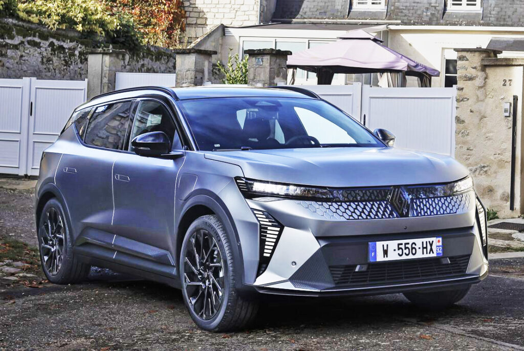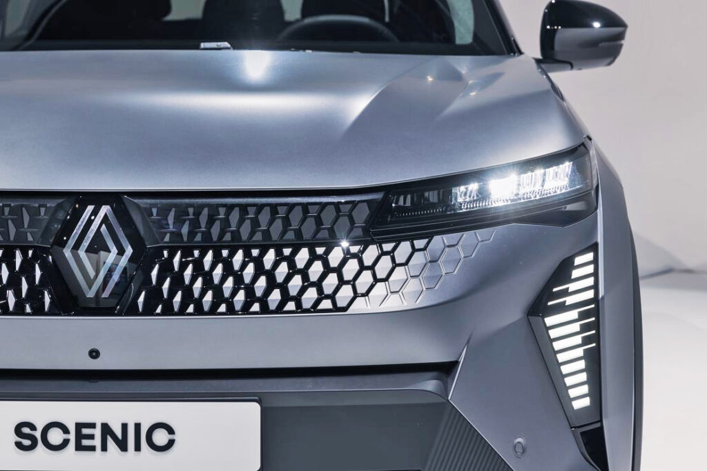 Su carrocería mide 4,47 metros de largo, 1,86 de ancho y 1,57 de alto. Aunque deja atrás la silueta monovolumen, no renuncia a ofrecer una buena habitabilidad. Su línea recuerda a un crossover bajo, con una aerodinámica muy trabajada: tiradores enrasados, llantas de 20 pulgadas con diseño específico, entradas de aire funcionales y una trasera afinada. El frontal muestra el nuevo lenguaje de diseño de Renault, con una firma luminosa en forma de rombo y una parrilla cerrada decorada con motivos geométricos.