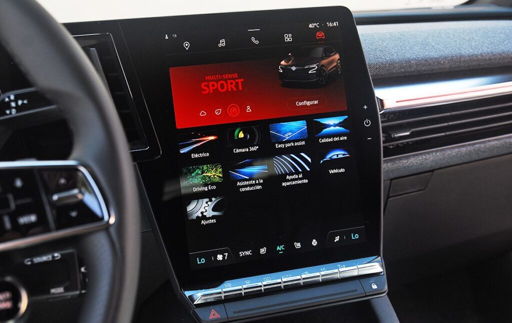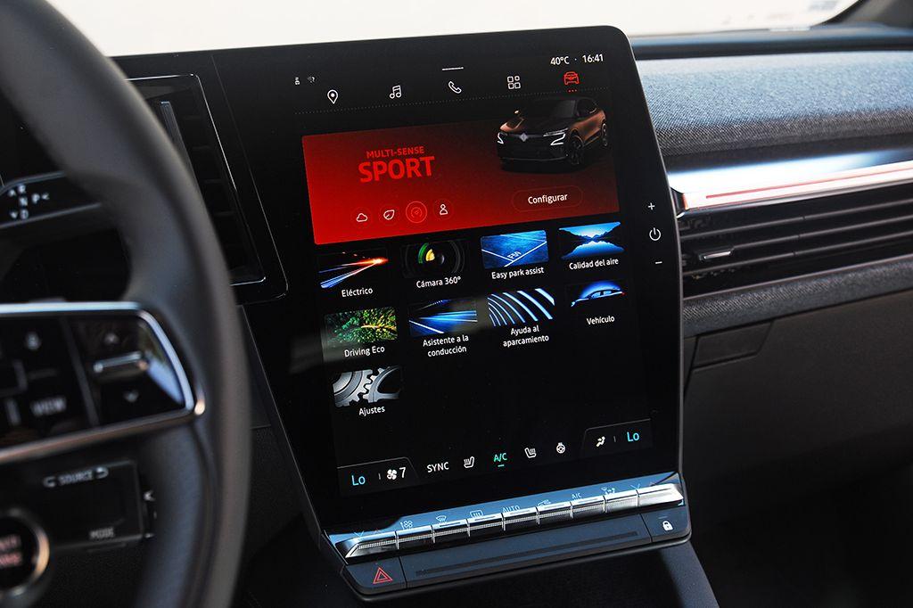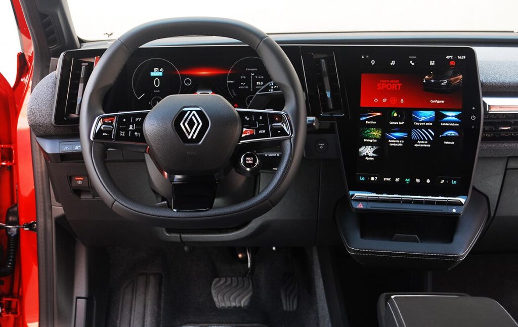 La pantalla multifunción, ubicada en la consola central, nos muestra un sistema multimedia desarrollado conjuntamente con Google que marca ampliamente la diferencia frente a cualquiera de sus competidores. En este sentido, Renault ha dado un salto de gigante en el que va a marcar tendencia en todos los segmentos. Su interfaz se ha personalizado para acoger, en la versión de 12 pulgadas, además de la visualización principal (navegación a través de Google Maps), dos widgets entre los que se proponen: recarga, flujo de energía, calidad del aire, presión de los neumáticos, música, etc. En la versión de 9 pulgadas, la pantalla se reparte entre cuatro widgets.