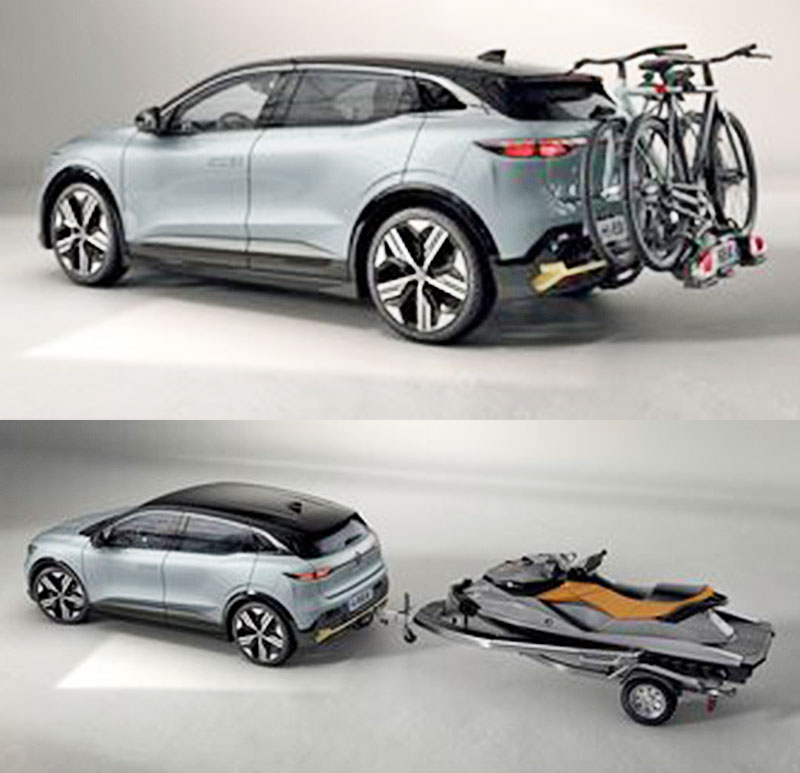 El Megane E-TECH dispone de una capacidad de remolcado al mejor nivel del mercado. Puede, con un enganche, llevar fácilmente un portabicicletas, y también arrastrar un remolque de hasta 900 kilos (remolque con freno, según versión). Puede asimismo recibir barras de techo disponibles como accesorio para cargar un cofre de techo, bicicletas, esquís, etc. de hasta 80 kg. Su uso es así aún más polivalente, a la altura de las expectativas del segmento.