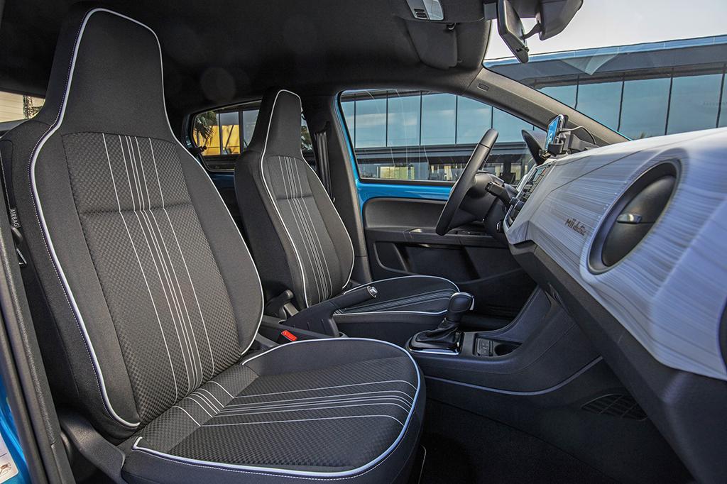 Ya en el interior, se observan cambios sutiles, como una innovadora moldura decorativa específica en el salpicadero y luz ambiental, que renuevan el aspecto interior del Mii electric. No hay mejoras en las calidades de los materiales frente a la anterior versión térmica. Todos los materiales, pese a ser muy sencillos, ofrecen un buen aspecto y una calidad de realización realmente buena. En cuanto a habitabilidad, gracias a las formas de la carrocería, es un coche muy bien aprovechado por dentro. En este sentido, no tengo dudas que estamos ante el coche más amplio de su categoría.