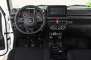 El panel de instrumentos, que nos ha maravillado por su diseño ochentero y grafismo ‘estilo GTI' pintado en color rojo (nos recuerda al del mítico Renault 5 Turbo 2), y todas las áreas circundantes, tienen un acabado resistente a los arañazos y a las manchas. Botones y manillas son fácilmente manejables tanto en condiciones off-road como si se usan guantes para conducir. El set de relojes está siempre iluminado para que éstos sean siempre visibles, especialmente en off-road donde se pasa de zonas soleadas a umbrías. Para que el uso del sistema de audio sea intuitivo, el más alto de gama se ha equipado con una unidad de audio compatible con el Smartphone a través de Bluetooth que cuenta con una pantalla táctil de 7 pulgadas. Como suele ser norma en Suzuki, la ergonomía está muy cuidada y el tacto de todos los mandos es extraordinario.Su habitáculo es muy satisfactorio en cuanto espacio. Todos los asientos son muy confortables y cuentan con un tapizado de tela que resulta acogedor y muy agradable. La postura de conducción, pese a que el volante no cuenta con regulación en profundidad, aunque sí en altura, resulta más que satisfactoria para acoplarnos a los mandos perfectamente.