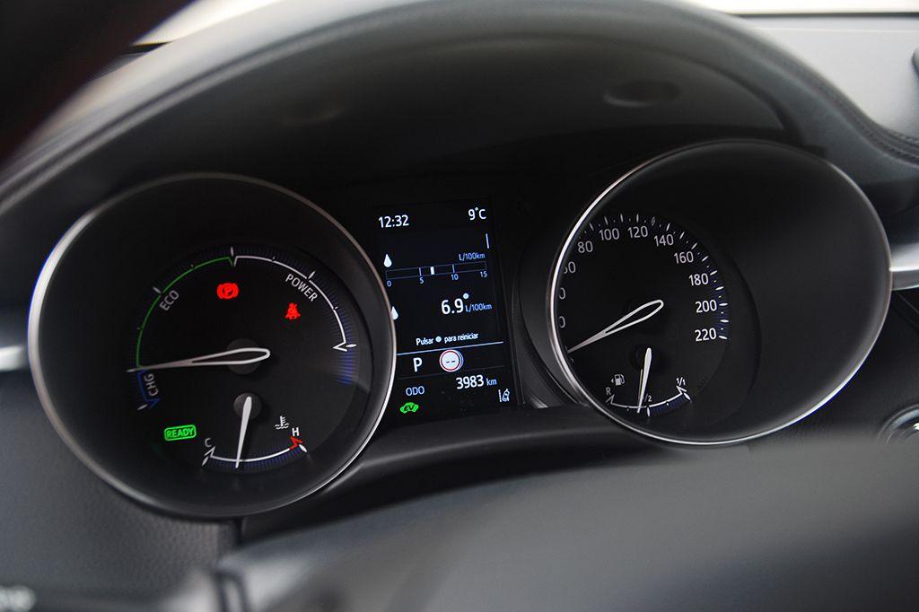 Me gusta que la instrumentación siga siendo tradicional. Ofrece una lectura muy clara y precisa. Además, en el centro de los dos diales, hay una pequeña pantalla digital donde se puede consultar mucha información sobre el consumo y el funcionamiento del sistema de propulsión, entre otras cosas. A toda la información se accede con facilidad, sin engorros.